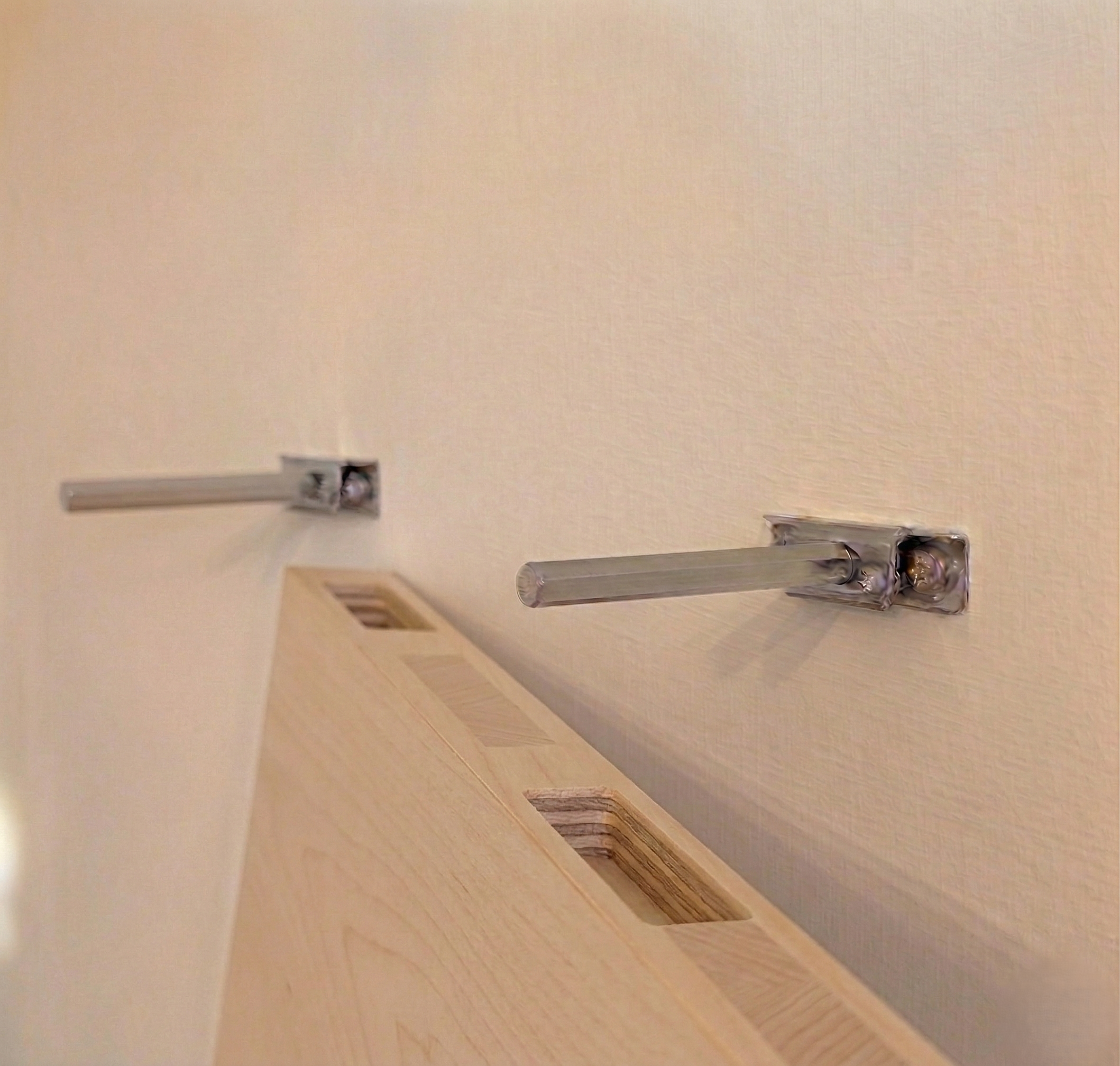 Das Regal wird mit einer verdeckten Wandhalterung montiert. Die Befestigung verschwindet vollständig im Inneren der Regalplatte und sorgt für die charakteristische schwebende Optik.