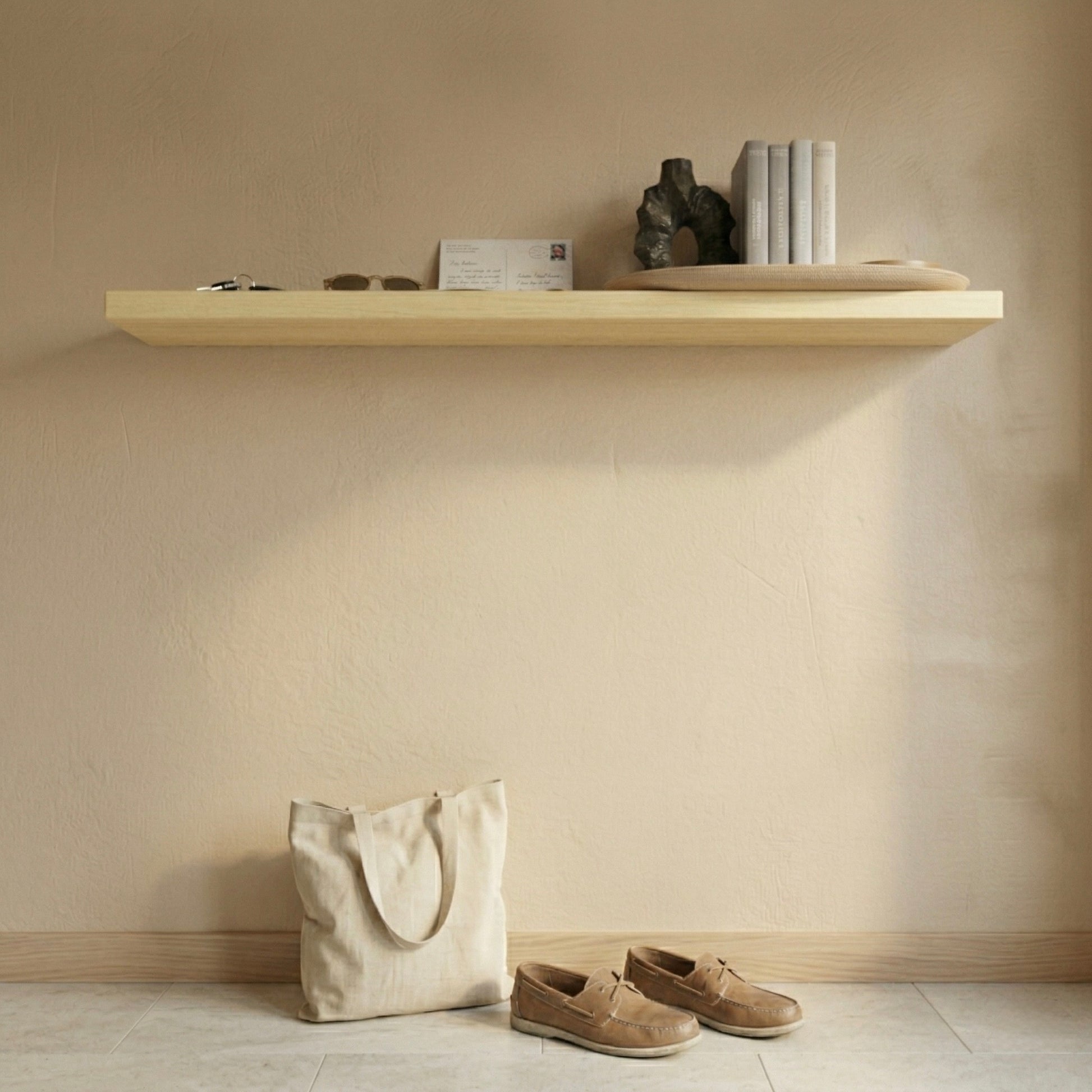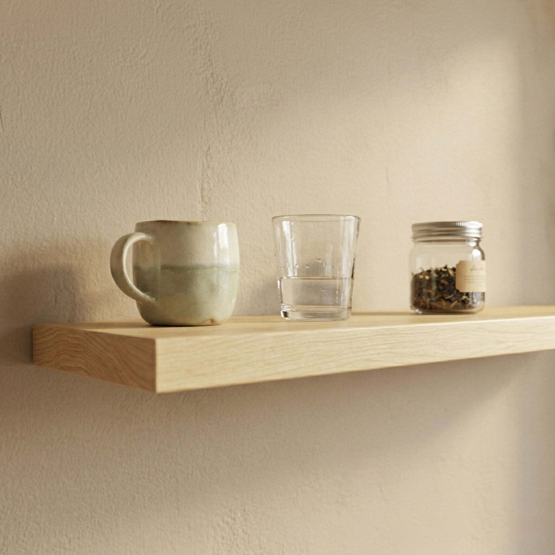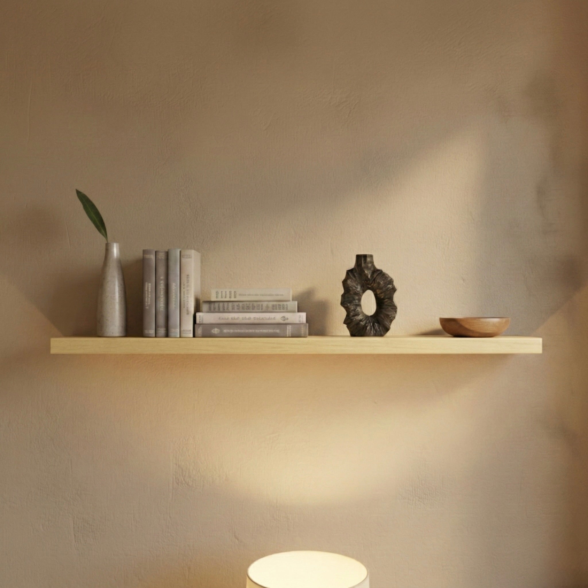 Das Wandregal wird aus sorgfältig ausgewähltem, massivem europäischem Laubholz gefertigt und in präziser Schreinerarbeit verarbeitet. Die Oberfläche wird von Hand mit hochwertigem Hartwachsöl behandelt, das das Holz schützt und seine natürliche Maserung hervorhebt. Durch die verdeckte Befestigung entsteht die charakteristische schwebende Optik – klar im Design, zeitlos in der Wirkung. Jedes Regal ist ein Unikat mit individueller Maserung und natürlichem Farbton.