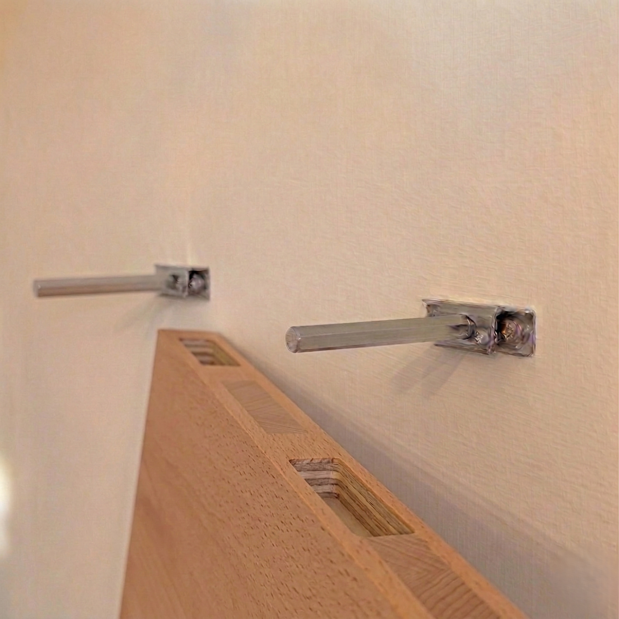 Das Regal wird mit einer verdeckten Wandhalterung montiert. Die Befestigung verschwindet vollständig im Inneren der Regalplatte und sorgt für die charakteristische schwebende Optik.