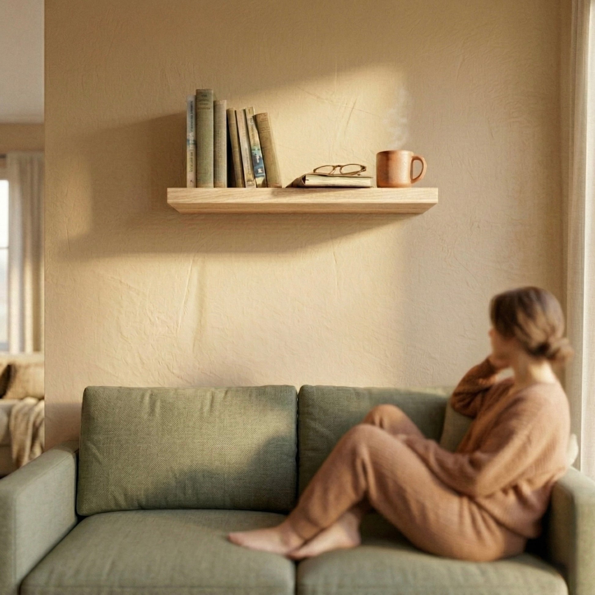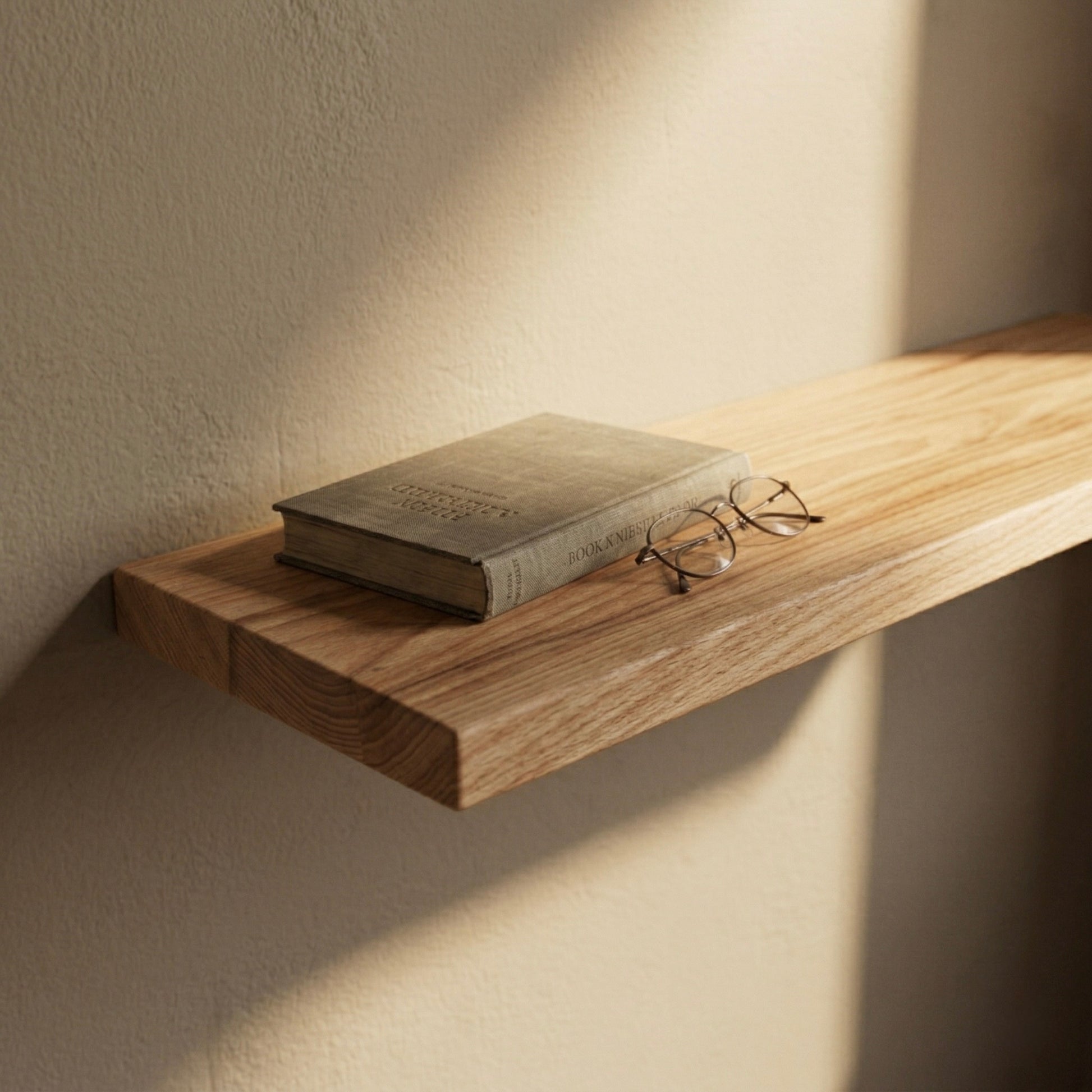 Das schwebende Wandregal aus massiver Eiche verbindet minimalistisches Design mit der natürlichen Schönheit echten Holzes. Durch die verdeckte Befestigung wirkt das Regal, als würde es frei an der Wand schweben – klar, ruhig und zeitlos.
