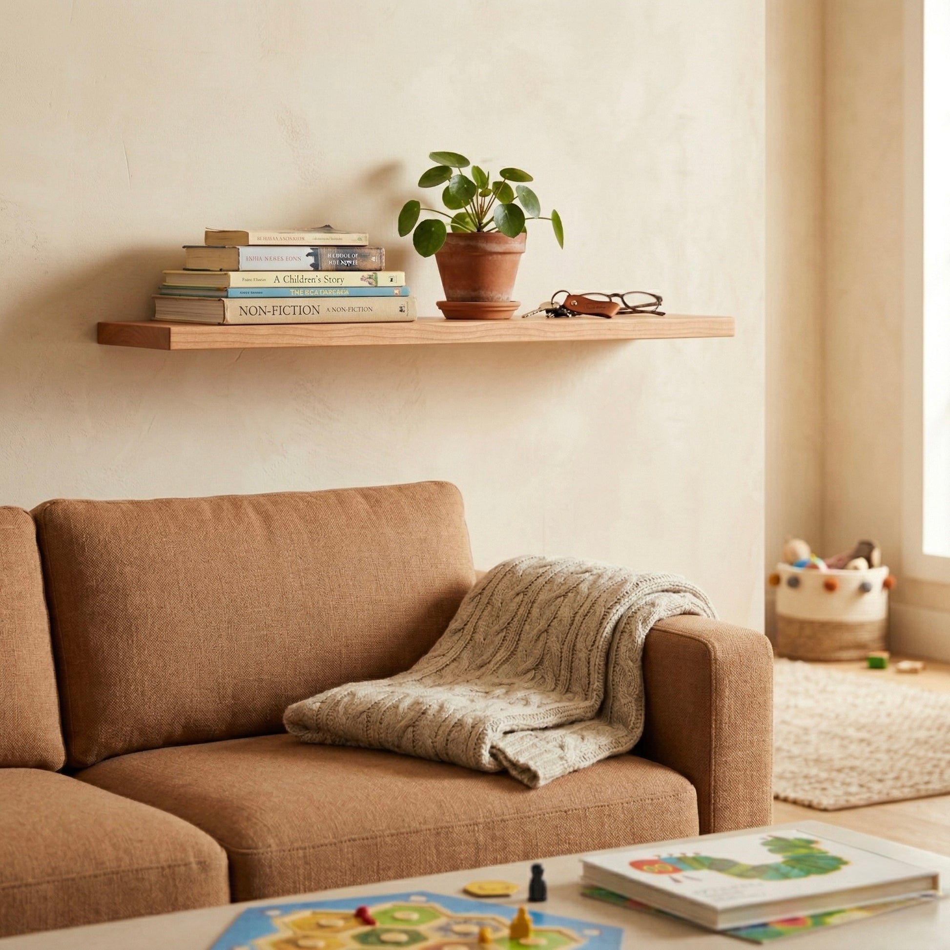 Das schwebende Wandregal aus massiver Eiche verbindet minimalistisches Design mit der natürlichen Schönheit echten Holzes. Durch die verdeckte Befestigung wirkt das Regal, als würde es frei an der Wand schweben – klar, ruhig und zeitlos.