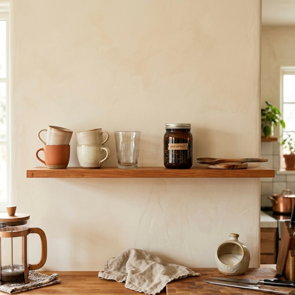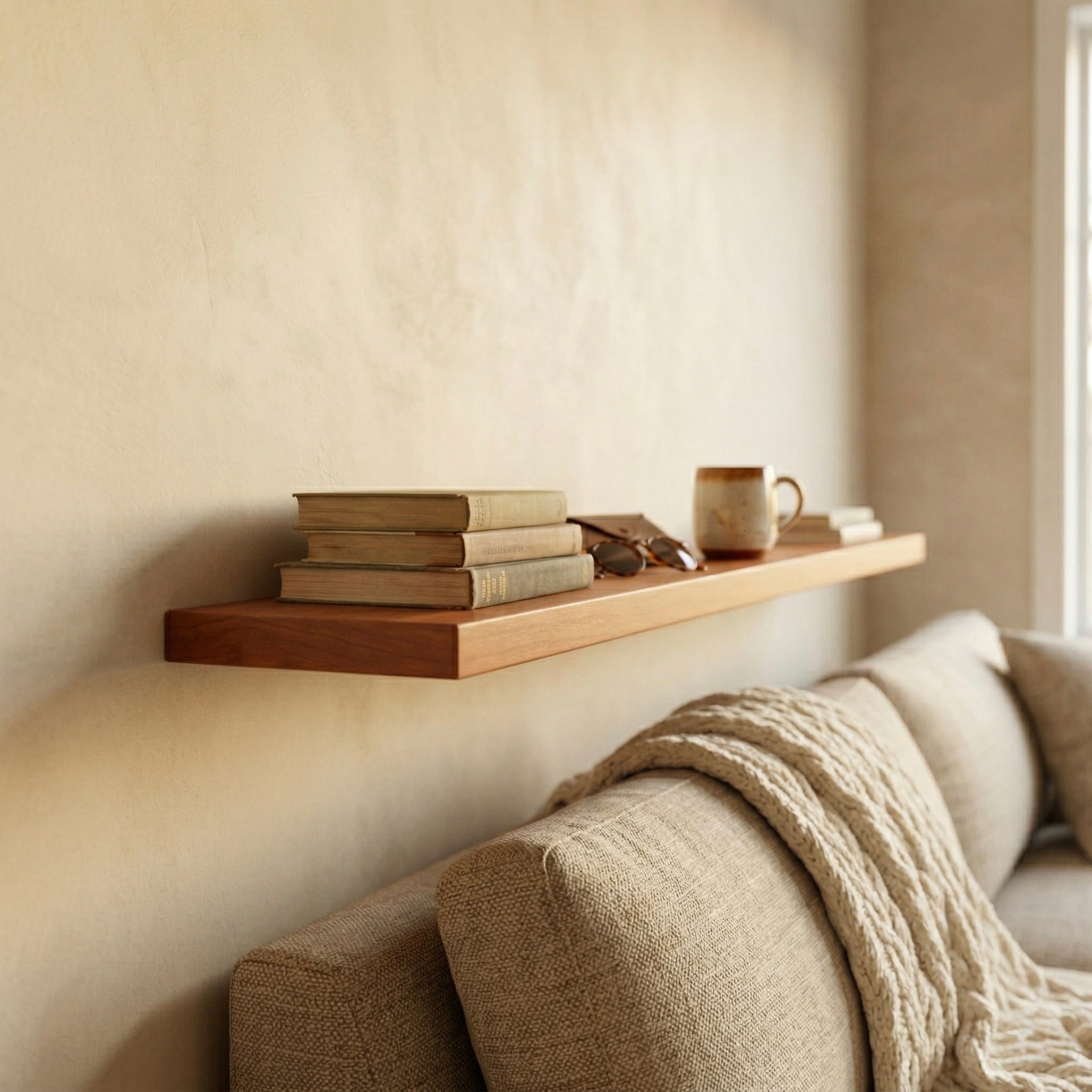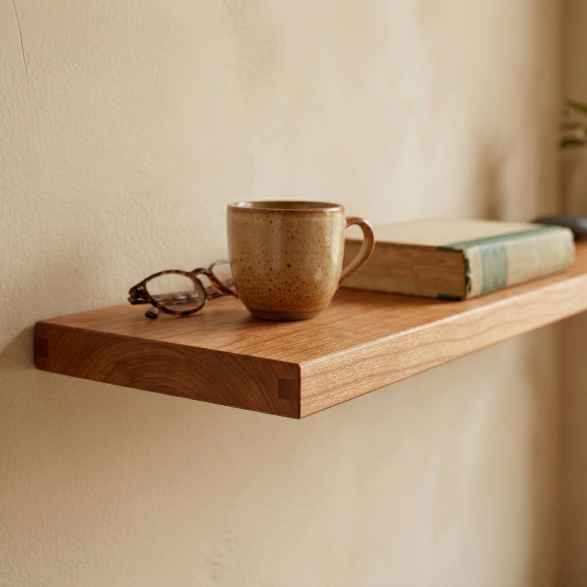 Schwebendes Wandregal aus Kirschbaum Massivholz mit stabiler unsichtbarer Metallhalterung zur Wandmontage.