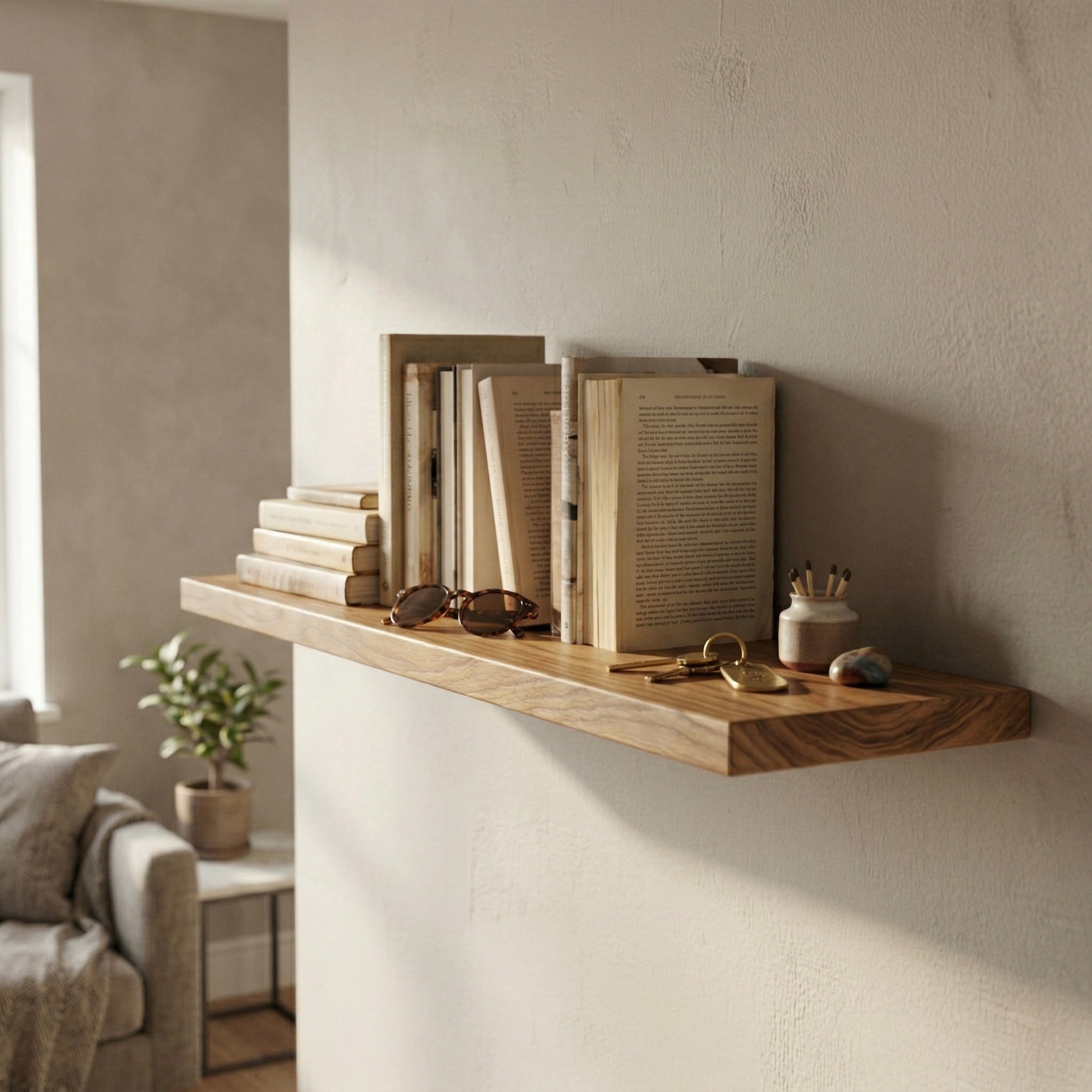 Schwebendes Wandregal aus Rüster Massivholz mit stabiler unsichtbarer Metallhalterung zur Wandmontage.