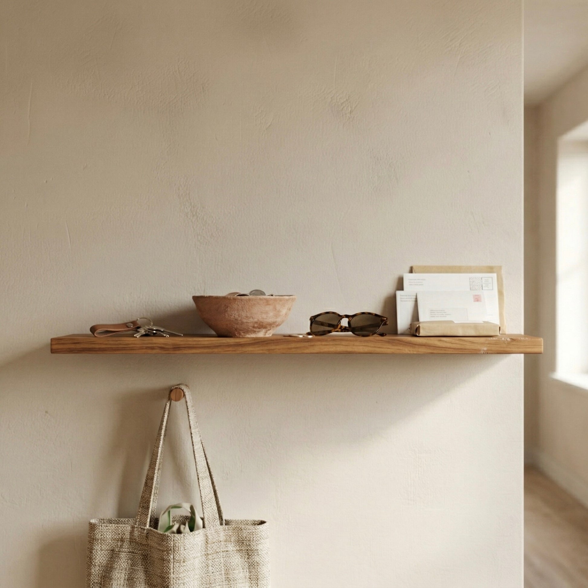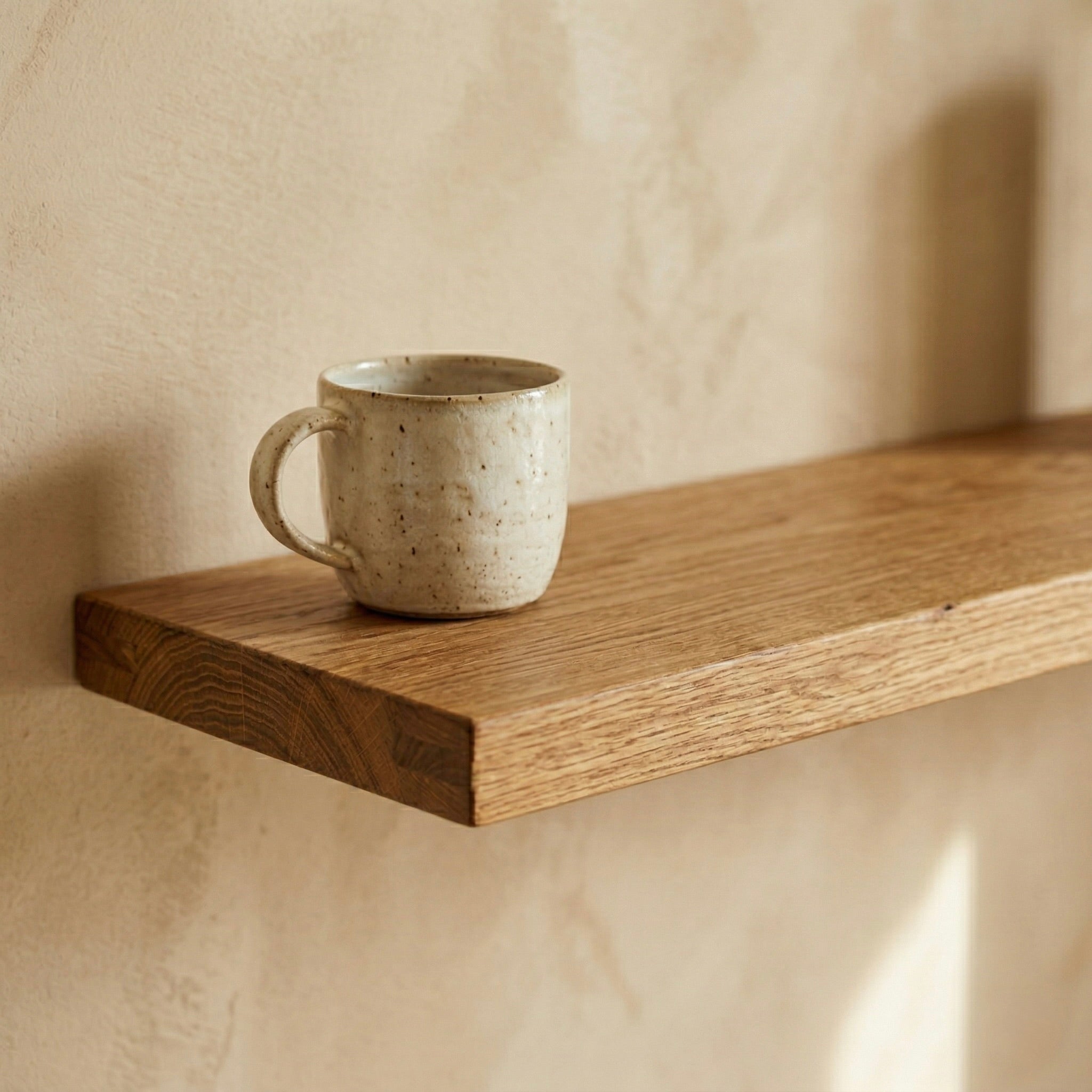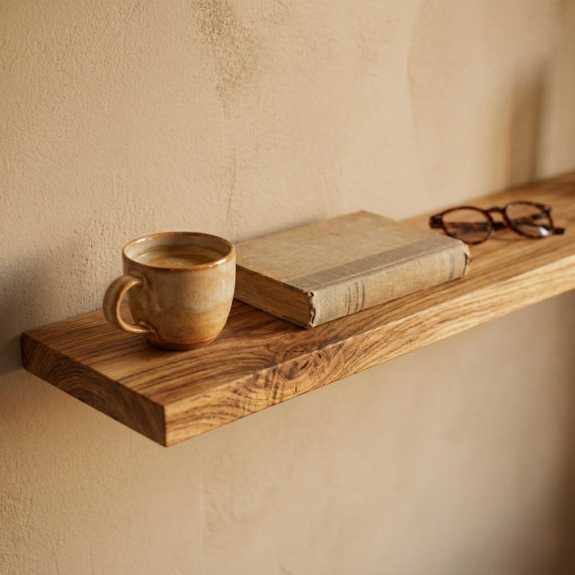 Das schwebende Wandregal aus massiver Eiche verbindet minimalistisches Design mit der natürlichen Schönheit echten Holzes. Durch die verdeckte Befestigung wirkt das Regal, als würde es frei an der Wand schweben – klar, ruhig und zeitlos.
