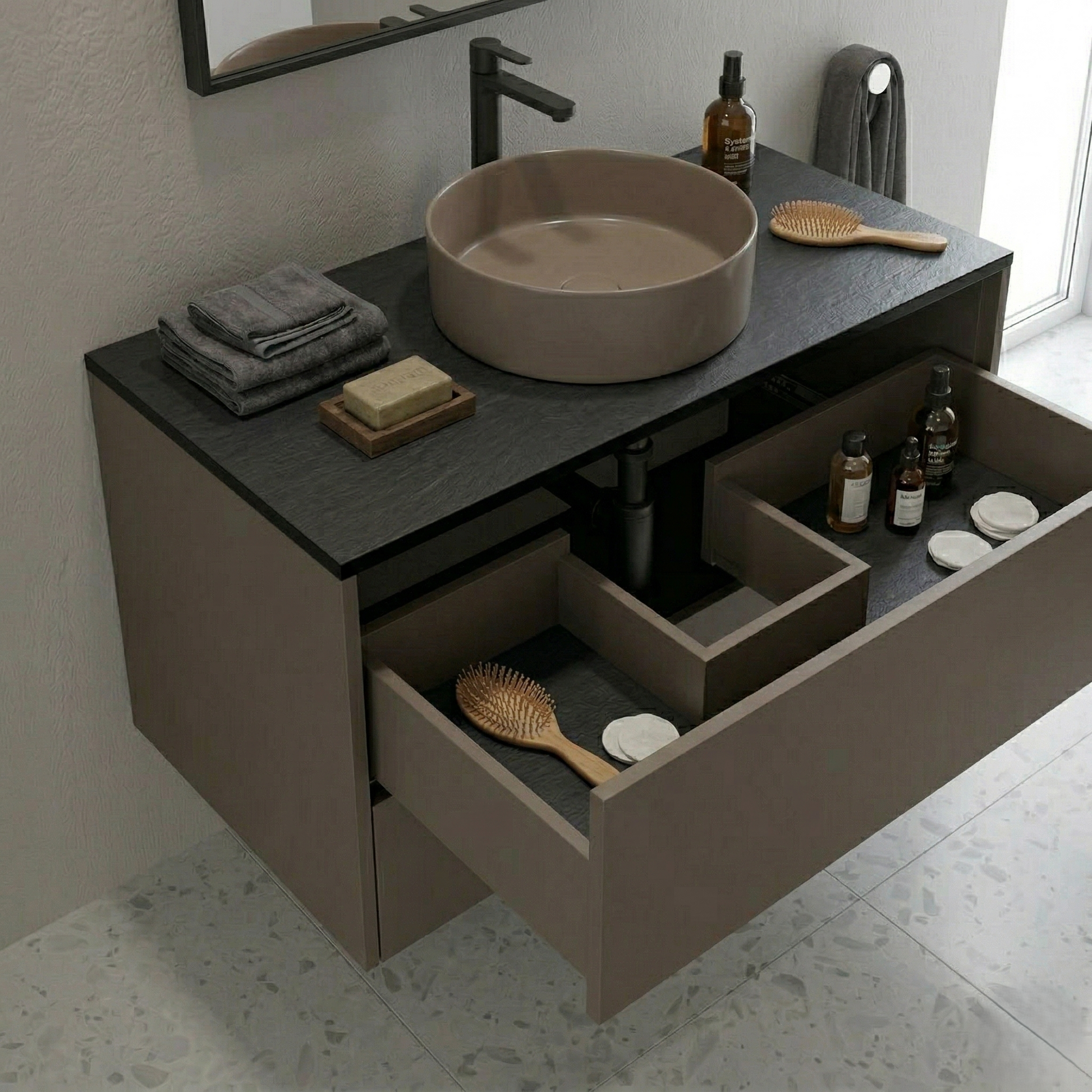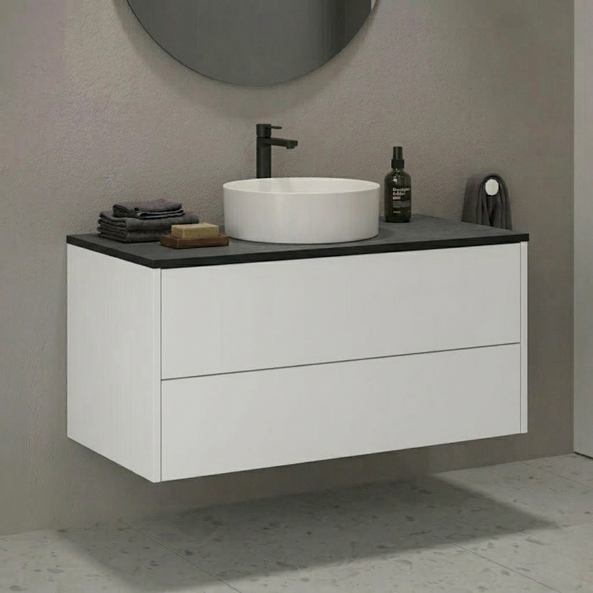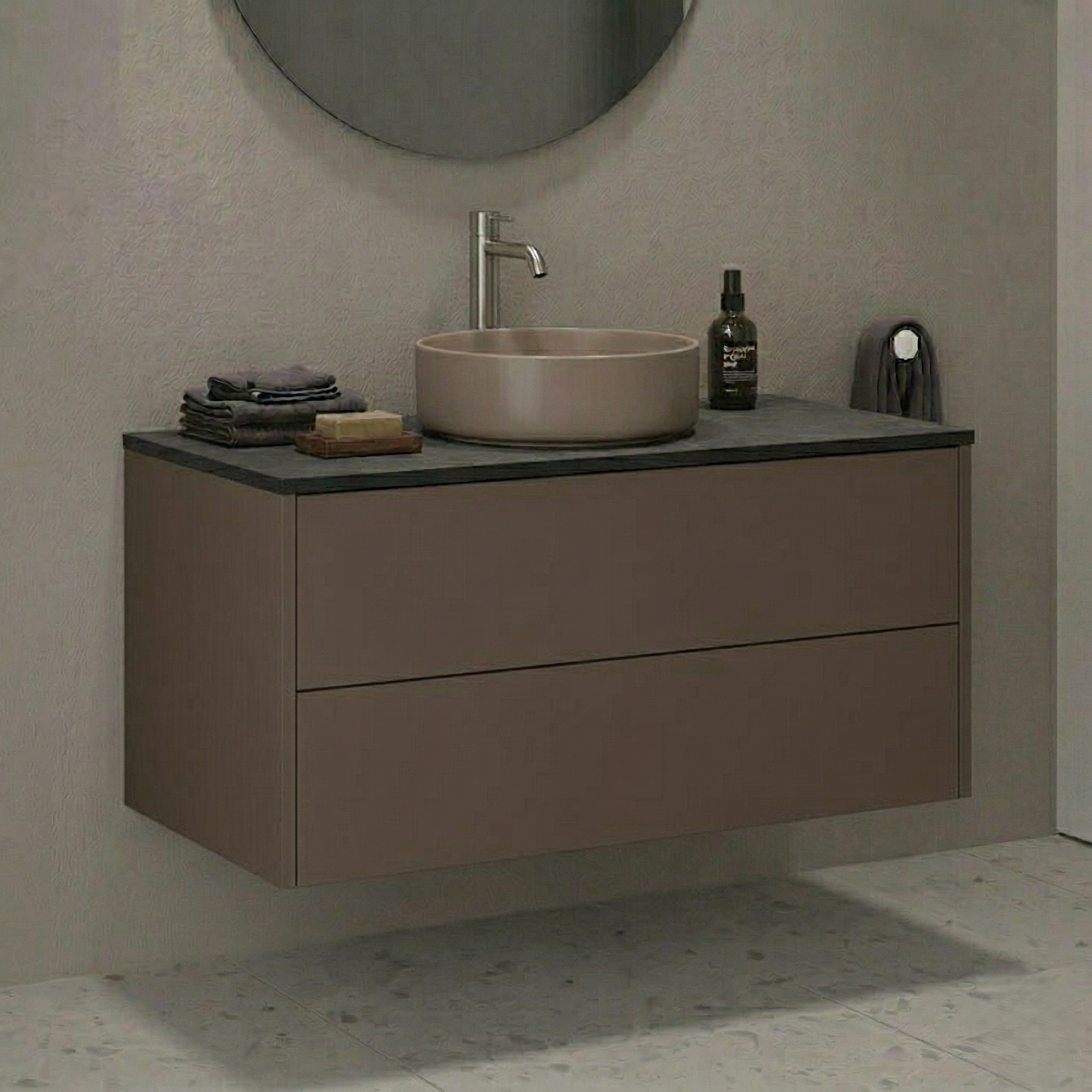 Dieser Waschtisch wird in unserer Schreinerei sorgfältig von Hand gefertigt. Die 12 mm dünne, vollständig wasserfeste Kompaktplatte sorgt für eine besonders reduzierte und moderne Optik, während der konsequent ohne Spanplatten gebaute Korpus eine langlebige und stabile Konstruktion gewährleistet – ausgelegt für den täglichen Einsatz im Bad.